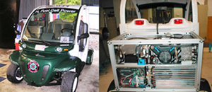Mike Strizki with Renewable Energy International developed a hydrogen fuel cell powered golf cart to serve as a neighborhood vehicle for the Mohegan Nations new Energy, Environment, Economics and Education Center. This modified GEM vehicle manufactured by Daimler Chrysler runs on compressed hydrogen, creating no emmissions.